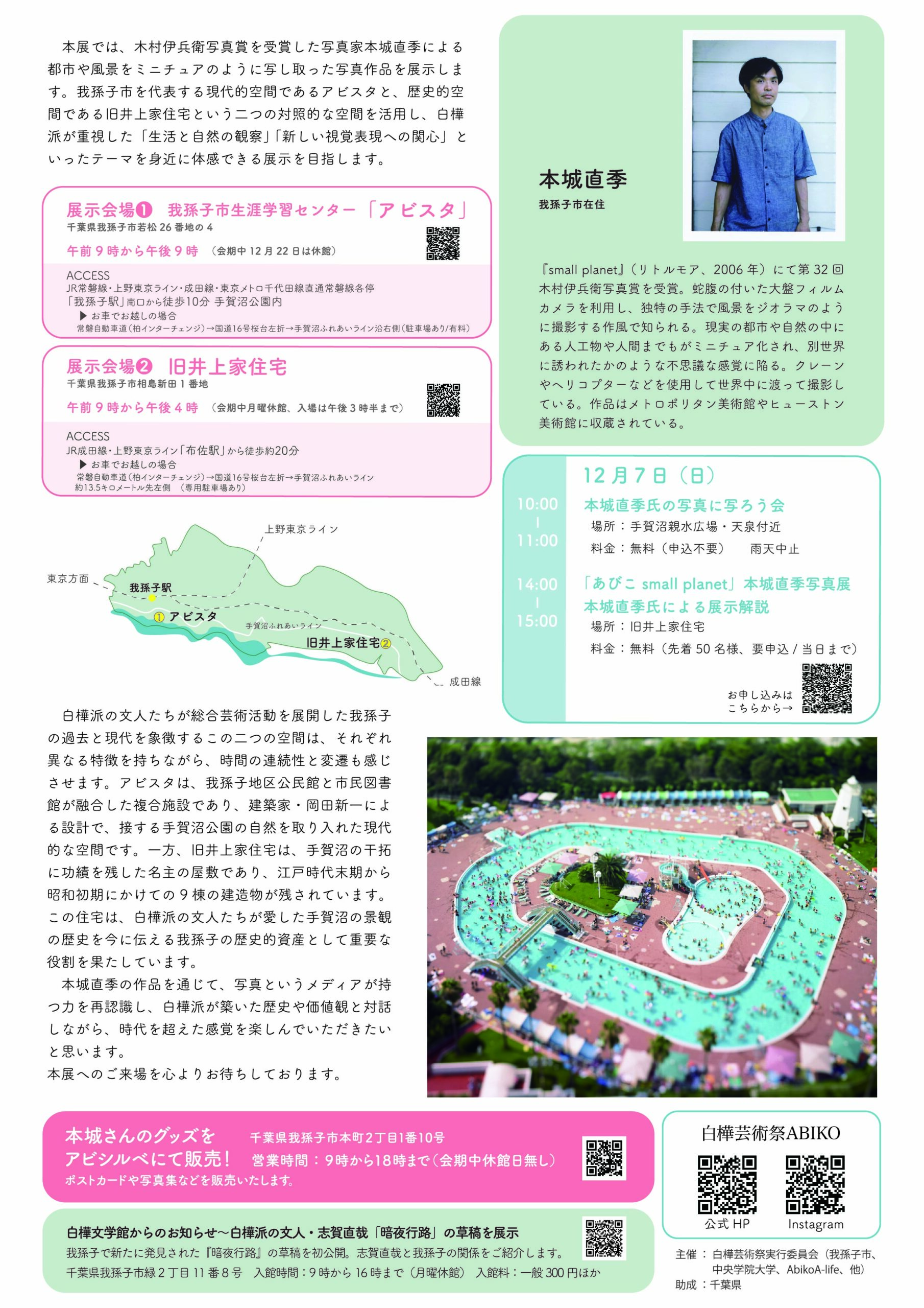 白樺芸術祭実行委員会(我孫子市ほか)は、市制施行 55 周年記念事業「白樺芸術祭 ABIKO」の一環として、写真家・本城直季氏(市内在住)の写真展を開催しています。